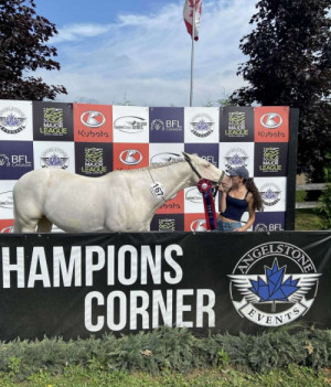 Sweet and people-oriented, Sky loves attention and will stand quietly for hours to be groomed, bathed, clipped, and loved on. She has a fully installed lead change and prefers a steady leg-to-hand connection into a soft, supportive ride. She is a prep ride and requires groundwork to keep her performing and behaving at her best.