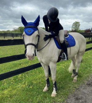 A lovely, bubbly mare who adores attention and is perfect for clipping, bathing, etc. She’s also fantastic out of the ring — hacks out like an old pro!