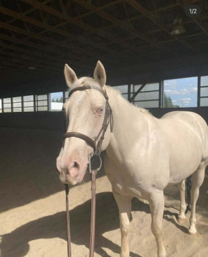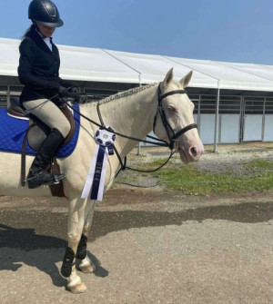 "Jube Jube" is a 13.3hh, 1990 perlino Connemara Welsh cross pony gelding. He is a multi-national and international winning champion pony. Jube has shown and won in the following: Hunters/Jumpers, Show jumping, dressage, OHTA, P.P.Gs, MGA and more. He has been in clinics/lessons under Anne Zander, Peter Grey, Leslie Salia, Michelle Cruikshanks, Jim Dunn, Joyce Cameron, and so many more! Jube is beginner-friendly on the ground and in the saddle. He is sane and safe in both the ring and out on trails alone or in a group. He is semi-retired, but can still jump 2' courses & do up to training level dressage tests. He is looking for the perfect match to continue being loved, shown off and adored. His last event on June 20th, 2021, he placed 2nd overall with a double clear and outstanding dressage marks! Videos available!