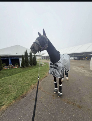 Cal is a barn favourite — he’ll stand for hours to be groomed, bathed, clipped, and loved on. Because of his light skin and eye colour, he’s always “dressed” to protect from UV exposure year-round, and he comes with all necessary equipment and tack, as well as his passport.