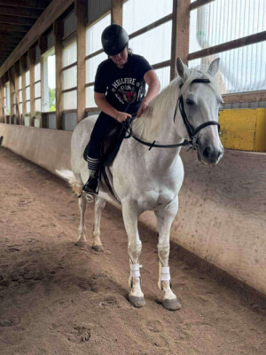 Valiant Bentley, aka Bentley, is a 16-year-old grey Welsh pony gelding. Bentley jumps a 2'ft course, easy to navigate and gentle. NOT your typical pony! He does require a minimum of 3 days a week of work to stay in his absolute best behaviour & healthy. He goes in a simple French link snaffle or D-ring happy mouth. His rider's weight limit is 75 pounds due to a sway back from his past home. The sway has improved and will continue with proper care. He is a packer in the ring and out on trails. He has one of the cutest canters to learn, happily does his job, and is a very uncomplicated ride. He is a babysitter & has been in a riding school program and part-boarded out for the last year. He is looking for a lease to continue being spoiled, loved and shown off. It comes with all equipment, blankets, and tacks as needed.